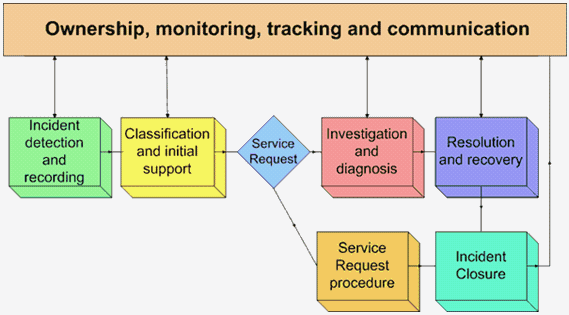En el proceso de manejo de incidentes vemos que se da como primera etapa la detección del incidente (es cuando el sistema presenta alguna anomalía o falla, y que esto se puede traducir en un error en el sistema o que el usuario no puede hacer algo y recurre a pedir ayuda); ya que lo tenemos identificado se hace una clasificación del incidente (vemos si el error que se presenta es conocido o si nunca se ha presentado) y de la mano va el soporte inicial (es el punto en el que el cliente llega a la mesa de servicio a solicitar ayuda, porque no sabe o no puede hacer algo); en caso de que el incidente sea conocido se hace el procedimiento de solicitud de servicio (se ejecutan los pasos a seguir según el manual de procedimientos para poder llegar a la solución de una forma viable y eficiente); una vez que ya que se la dio una solución al incidente por medio del manual de procedimientos se recurre a la documentación y contabilización del incidente, para ver que tanta incidencia tiene este caso; finalmente se hace una evaluación para ver si efectivamente se resolvió el incidente de forma satisfactoria y en supuesto de ser afirmativa se cierra el incidente y el otro supuesto seria que de la solución que se planteo no es lo suficientemente eficiente o acertada para que resuelva el problema y se recurre a hacer una investigación y un diagnostico de la situación para ver como es que se puede atacar el problema de frente y resolverlo; una vez que se tiene todo un contexto analizado se recurre a la ejecución de la propuesta de solución del incidente y se hace un estudio para ver si el incidente es recuperable o si es caso perdido (la mayoría de los casos son recuperables, peo cuando el nivel de daño es muy fuerte, se da el caso de que se de por perdido); y finamente se cierra el incidente y esta solución se documenta en una base de datos a la que se le llama base del conocimiento o Knowledge Data Base (aquí vienen documentadas todas las soluciones, y se establecen los pasos a seguir para que se hagan de forma eficiente) para que al momento de volverse a presentar el incidente ya va a estar documentado y esto hace que sea mas fácil, rápida y eficiente su resolución.